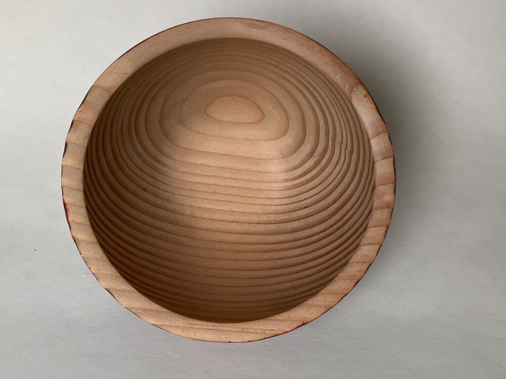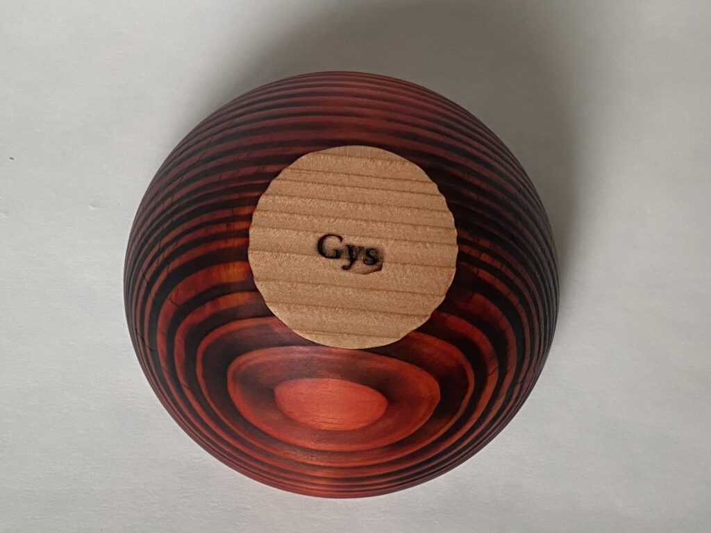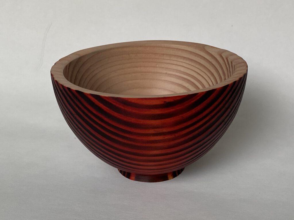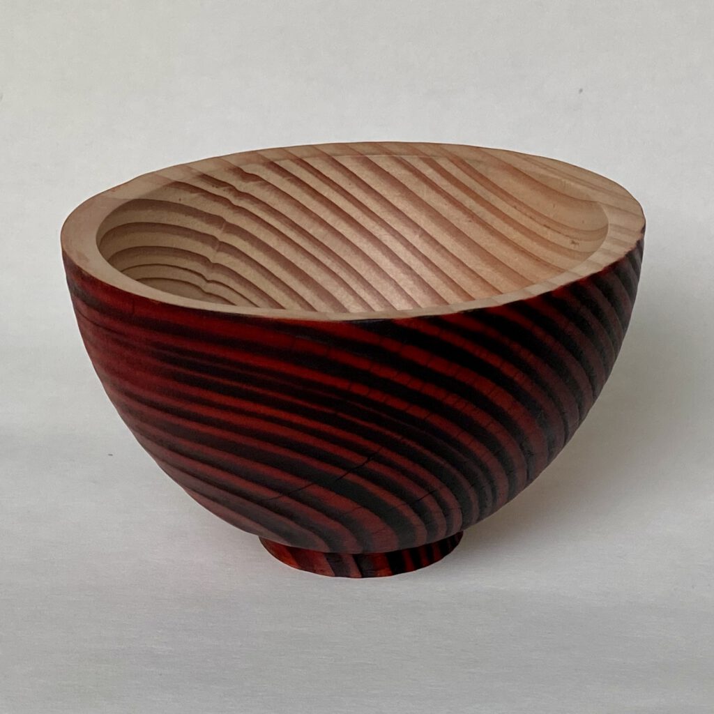 kant van het schaaltje zorgvuldig te branden, worden de jaarringen extra zichtbaar én voelbaar. Dit geeft het houten schaaltje een natuurlijke en karaktervolle uitstraling. Vervolgens is de buitenzijde afgewerkt met een rode spirit stain, waardoor het hout een eigentijdse en speelse uitstraling krijgt, terwijl de houtstructuur mooi zichtbaar blijft.