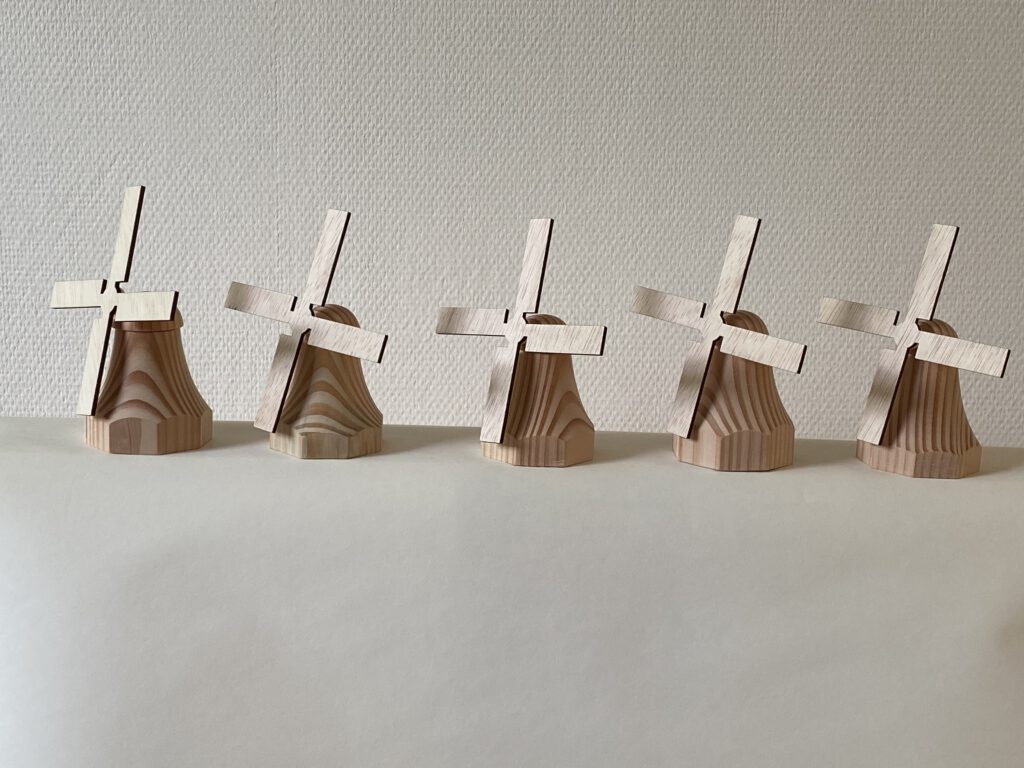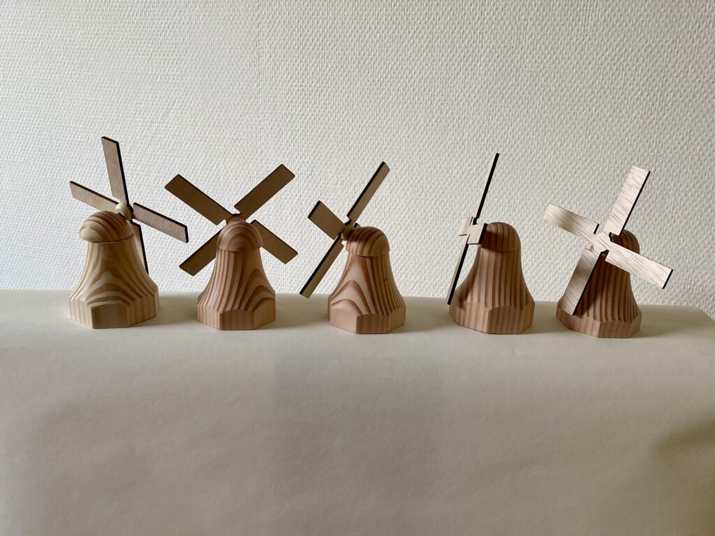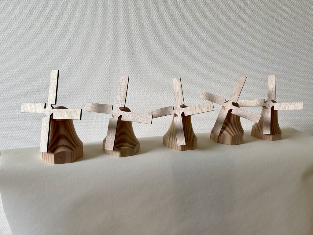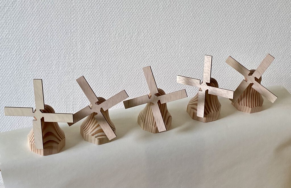 De wieken zijn uitgesneden met een lasersnijder. Hierdoor hebben ze een strakke afwerking, door de as van metaal kunnen ze soepel draaien. Dit geeft het houten molentje een speels en realistisch karakter.